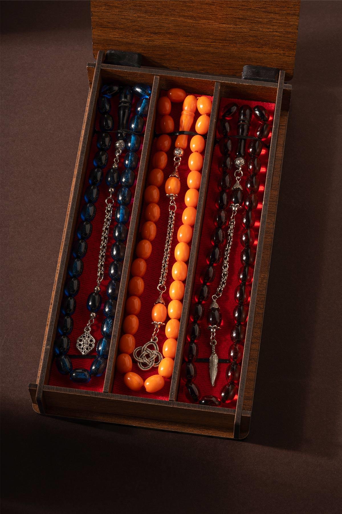 3'lü Ahşap Kutuda Özel Püsküllü Toz Kehribar Tesbih Seti (E47861)