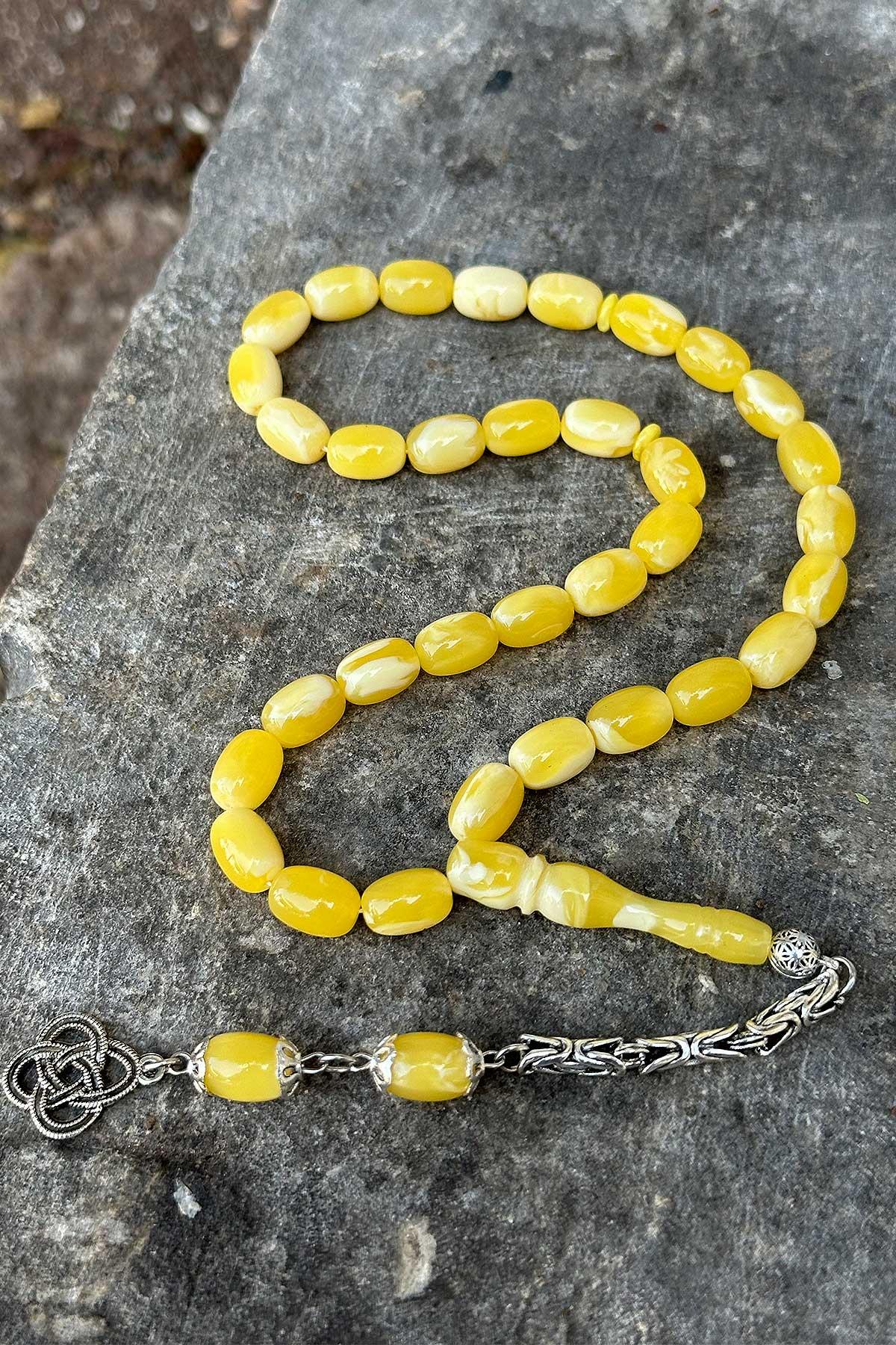 Bu eşsiz tesbih, yüksek kaliteli malzemelerden üretilmiş olup, renk tonları ve hareleriyle doğal kehribarı andırmaktadır. Her bir tanenin özenle işlenmiş olması, tesbihin estetik değerini artırır ve elde rahat bir tutuş sağlar. Tek dal kral zincir ile püsküllenen bu tesbih, zarif ve şık bir görünüm sunar.