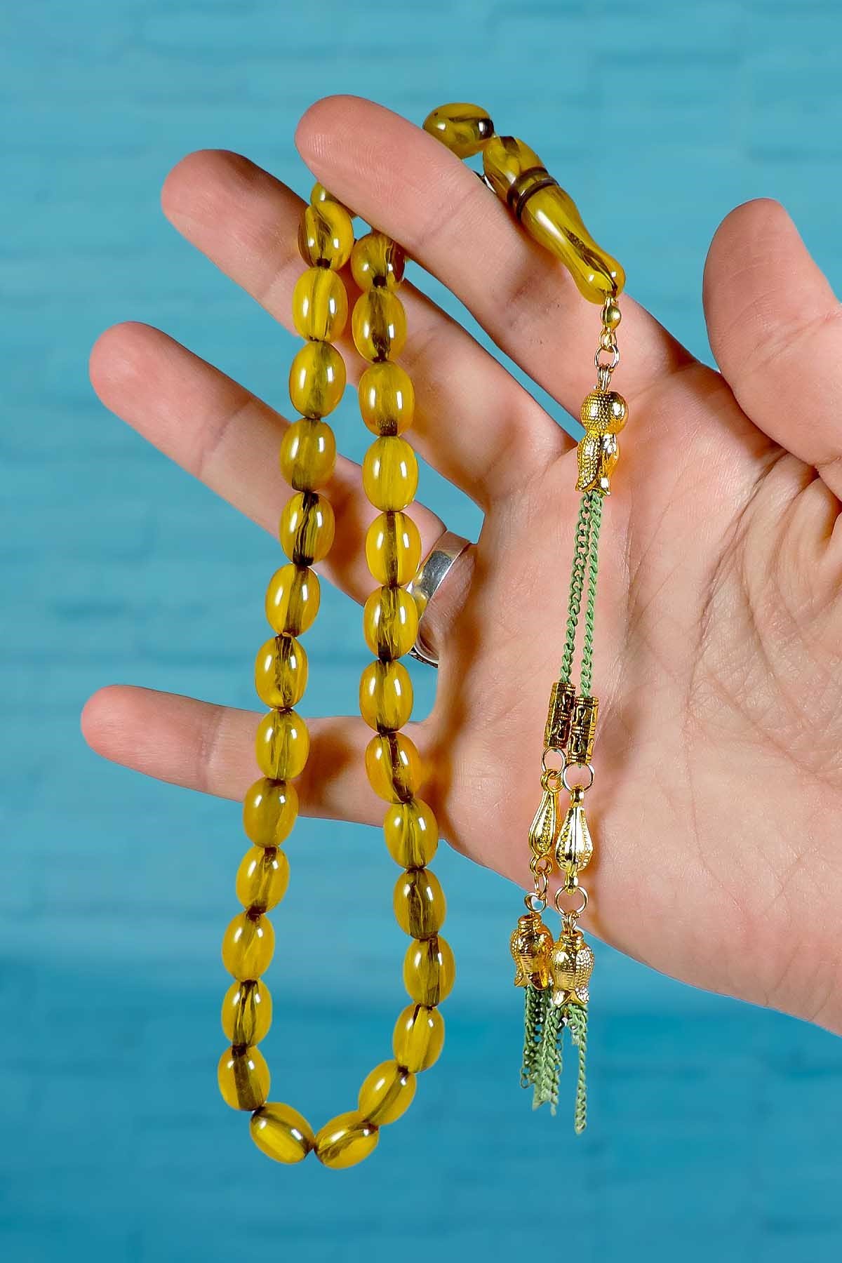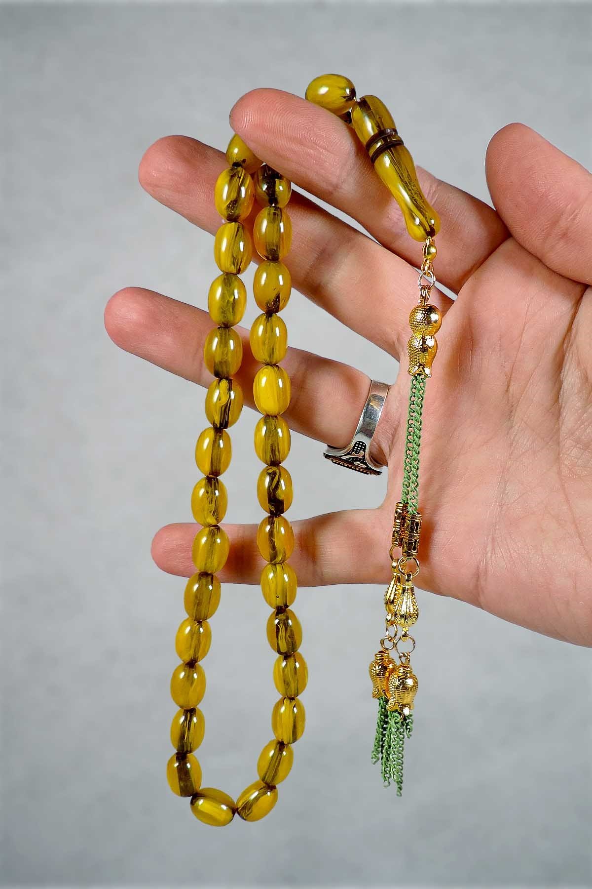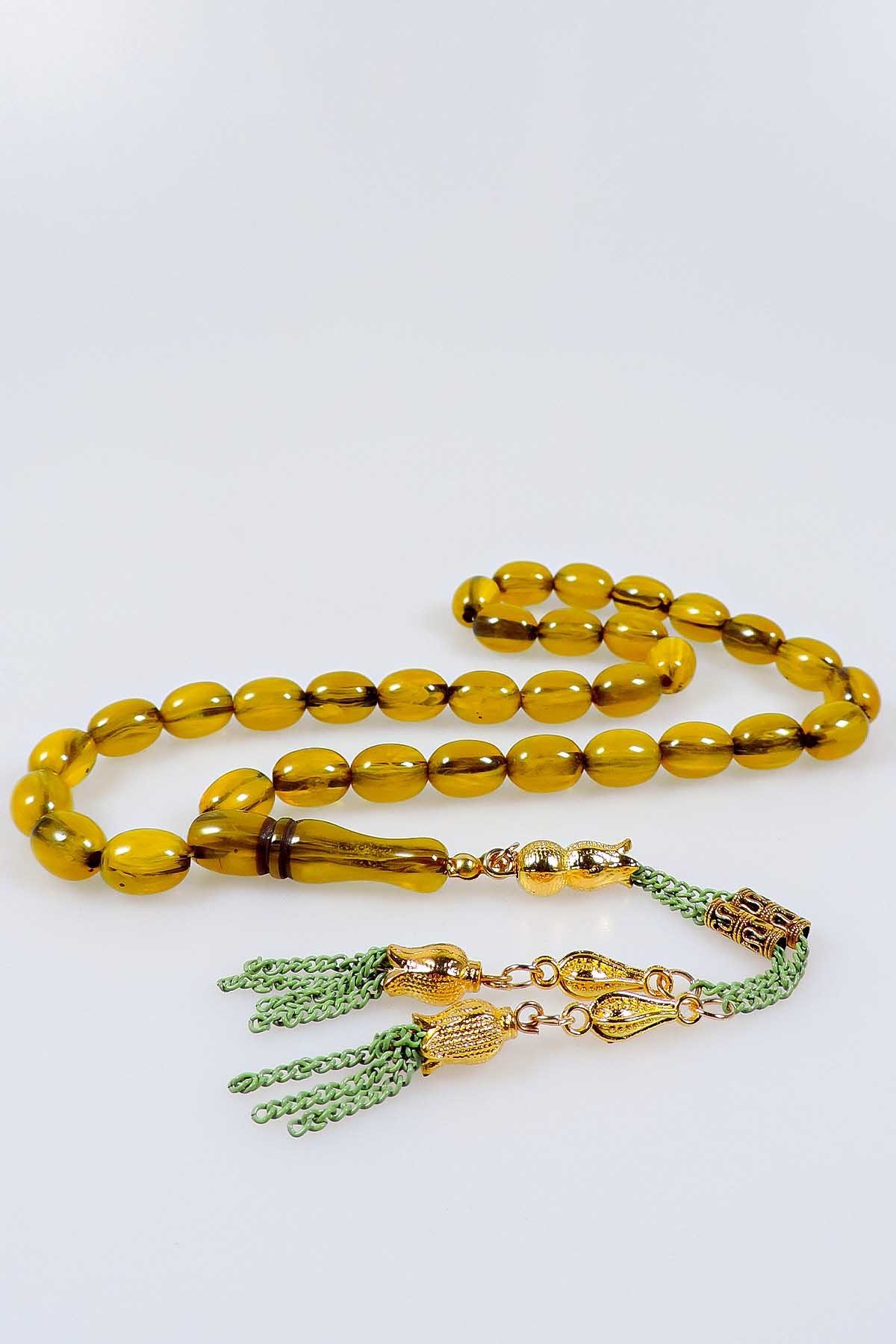 Sarı Lale Püsküllü Yeşil Hareli Renk Toz Kehribar Tesbih (YNT139)